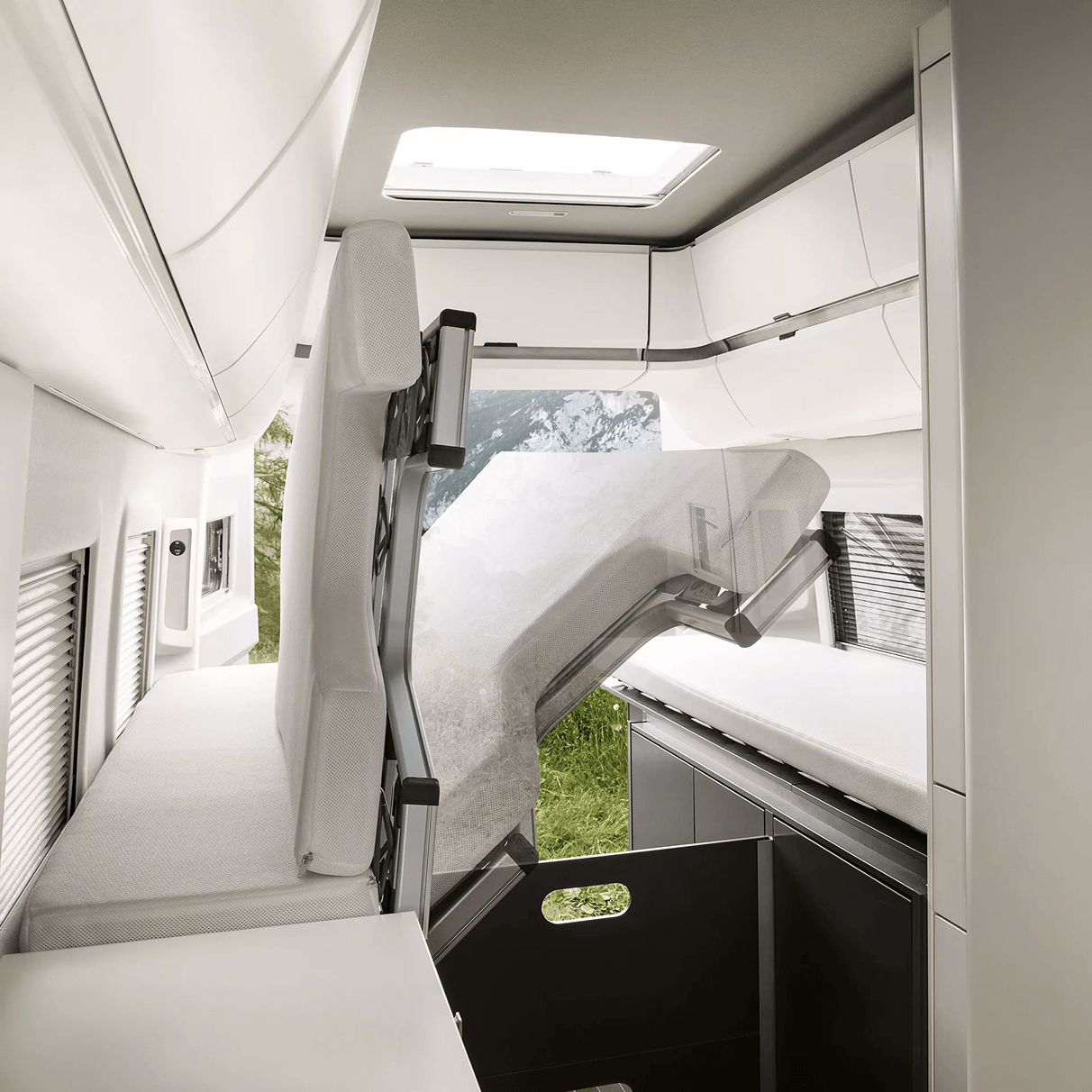 - Papildomai pasirenkama ištraukiama lova palubėje automobilio priekyje (plotis 1,22 m, ilgis maks. 1,90 m / min. 1,60 m) su kopėčiomis, naktiniu šviestuvu ir ypač dideliu panoraminiu langu