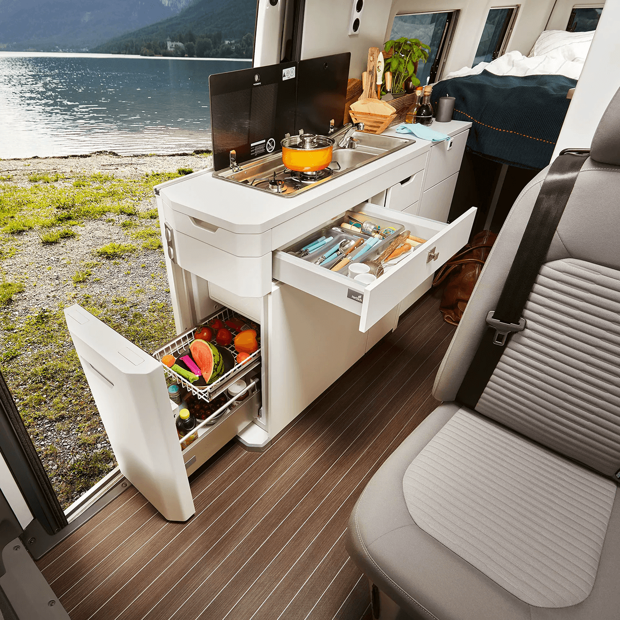 Jūsų bilietas į nepamirštamas šeimos akimirkas: šešių metrų ilgio Grand California 600 yra pakankamai kompaktiškas mažoms stovyklavietėms, tačiau papildoma įranga suteiks užtektinai vietos keturių asmenų šeimos išvykoms. Du suaugusieji gali patogiai miegoti ant spyruoklinės lovos gale, o pasirenkama lova palubėje jūsų vaikams suteikia dvi papildomas jaukias miegamąsias vietas, kuriose jie gali sapnuoti savo įdomius atostogų nuotykius.